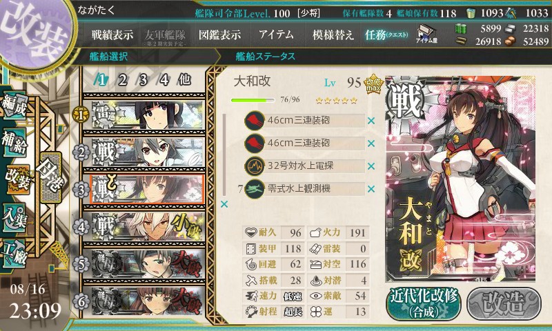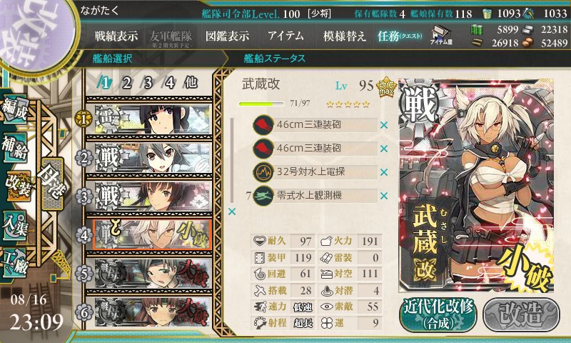 こちらの被害も相当なものになるのが常。特に大和や武蔵が大破すると、その修理に必要な資材に頭が痛くなります。強い分、リスクも承知です!