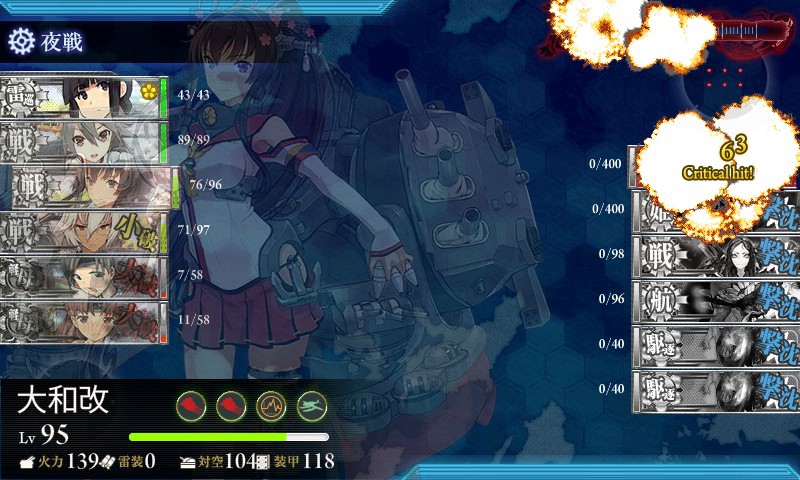 この挑戦はかなり運がよかったです。夜戦突入時、こちらは北上、榛名、大和、武蔵の4人を残して、敵はボス2体という状況。