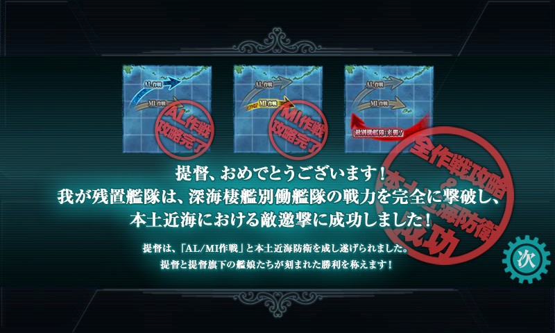そして、これをもってAL作戦、MI作戦、本土防衛作戦を攻略!夏イベント、全制覇です!!