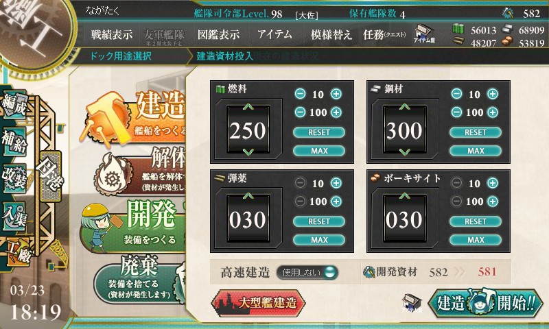 そしてこの調子でビスマルクを建造しようと意気揚々にチャレンジ。ビスマルクは「大型建造」のため、資材消費が普通の建造の比ではありません。1回1回のチャレンジがまさに死活問題です。
