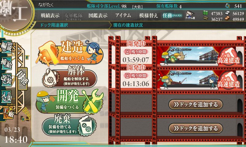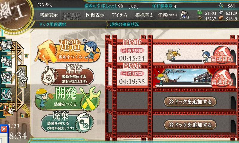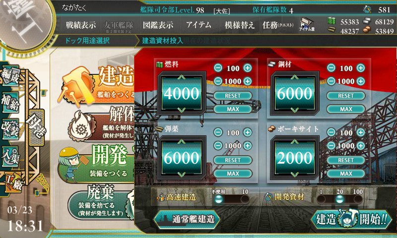 1回目。4時間20分でした。残念…。しかし今回は資材に余裕があるのでもう一度だけチャレンジします。残りはイベント攻略のために確保しなければならないので冷静に…(笑)