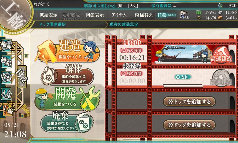 建造時間16分。これは「まるゆ」確定の建造時間です。まるゆは大型建造のみ出現し、他の艦娘に近代化改修すると運を上昇させるという能力があります。廃人レベルになると、恐らくまるゆはいくらあっても足りないでしょう(笑)