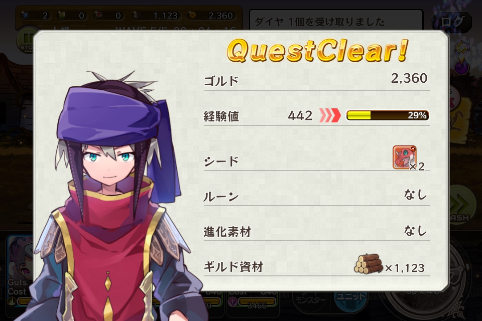 獲得したゴルドは2360、経験値は442、ギルド資材は1123でした。