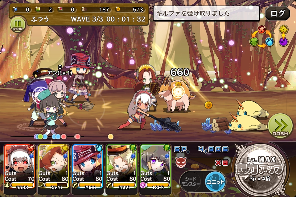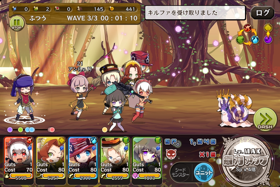後続のモンスターが追い付いてくると厄介なので、攻撃力の高い後衛ユニットで早めに倒します。