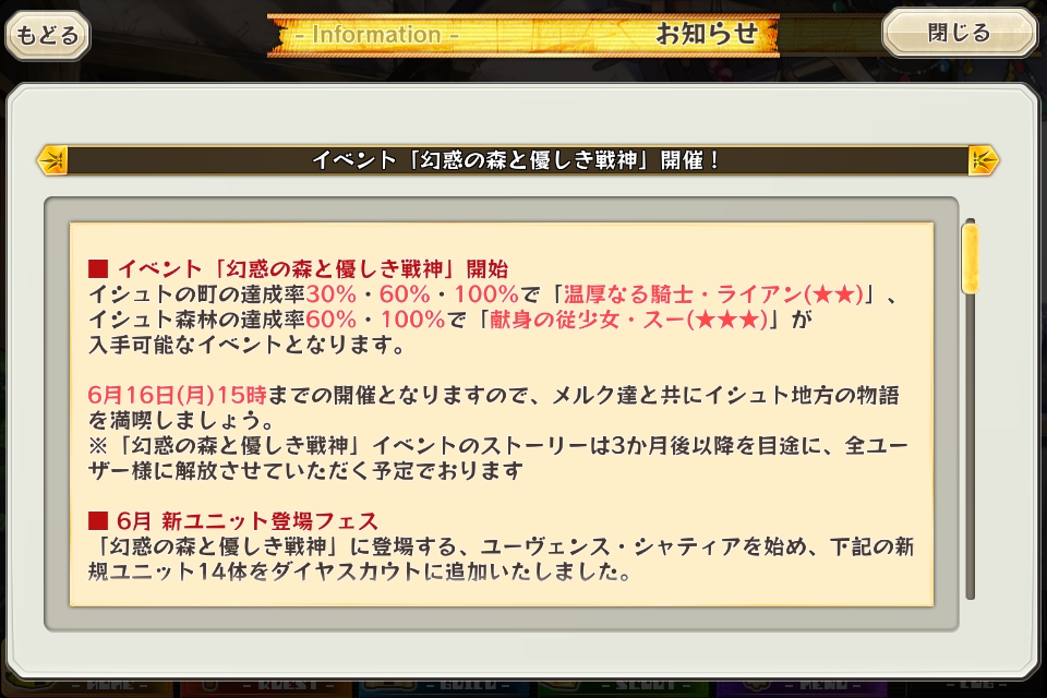 メルクストーリアでは5月31日(土)の15時から6月16日(月)の15時まで、新イベント「幻惑の森と優しき戦神」が開催されています。