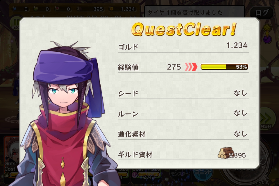 獲得したゴルドは1234、経験値は275、ギルド資材は395でした。