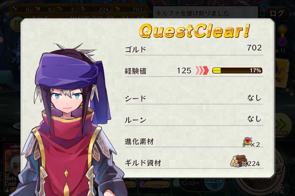 獲得したゴルドは702、経験値は125、ギルド資材は224でした。