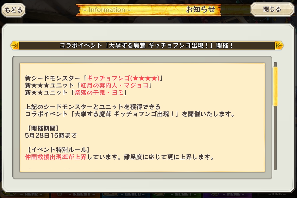 メルクストーリアでは5月21日(水)の15時から5月28日(月)の15時まで、新イベント「大挙する魔茸 ギッチョフンゴ出現!」が開催されています。