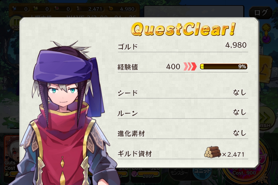 獲得したゴルドは4980、経験値は400、ギルド資材は2471でした。