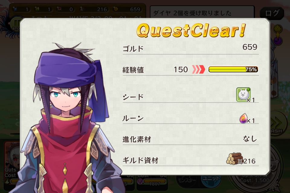 獲得したゴルドは659、経験値は150、ギルド資材は216でした。