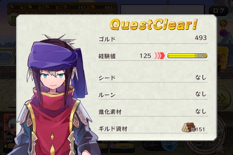 獲得したゴルドは493、経験値は125、ギルド資材は151でした。