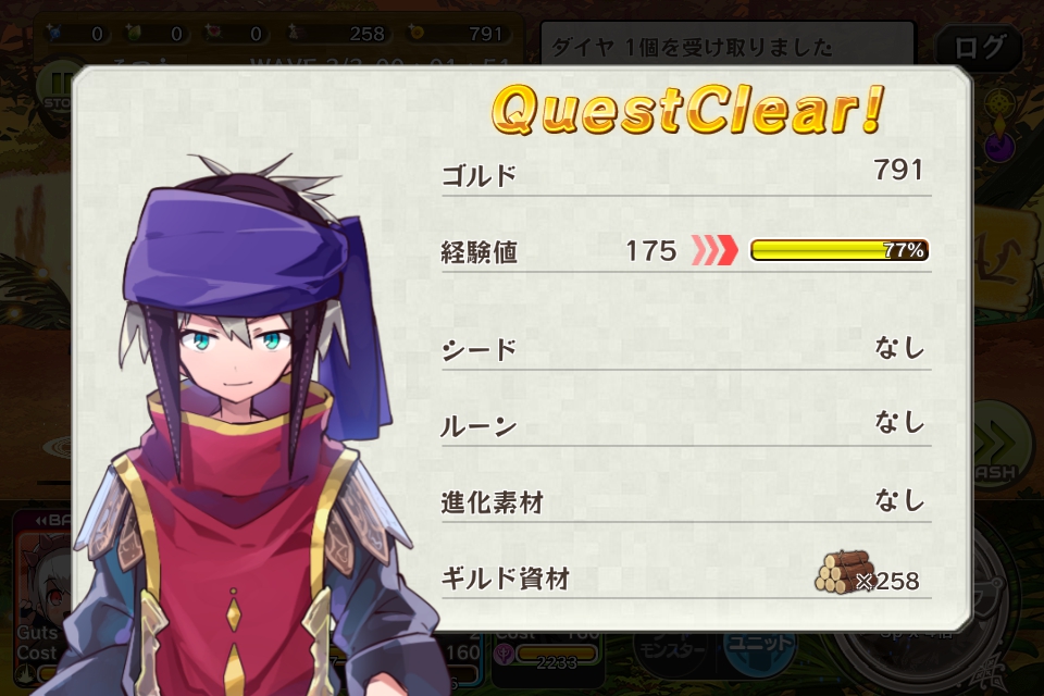 獲得したゴルドは791、経験値は175、ギルド資材は258でした。