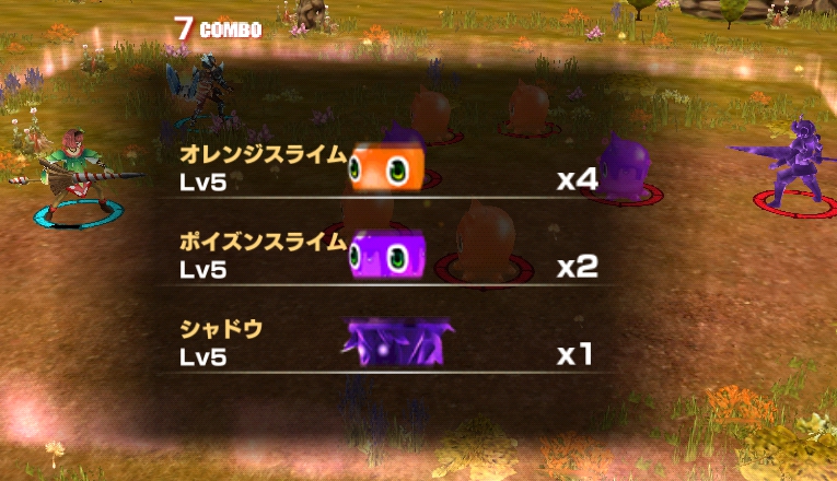 ここでは、オレンジスライムが4体、ポイズンスライムが2体、シャドウが1体、登場します。