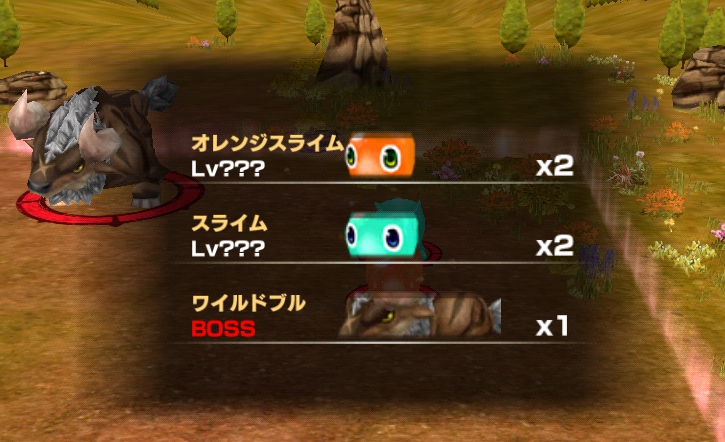 ここでは、オレンジスライムが2体、スライムが2体、ワイルドブルが1体、登場します。