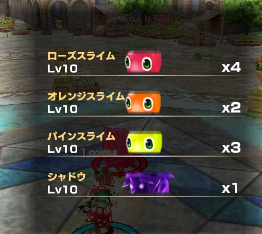 ステージ2では、ローズスライム4体、オレンジスライム2体、パインスライム3体、シャドウ1体が登場します。