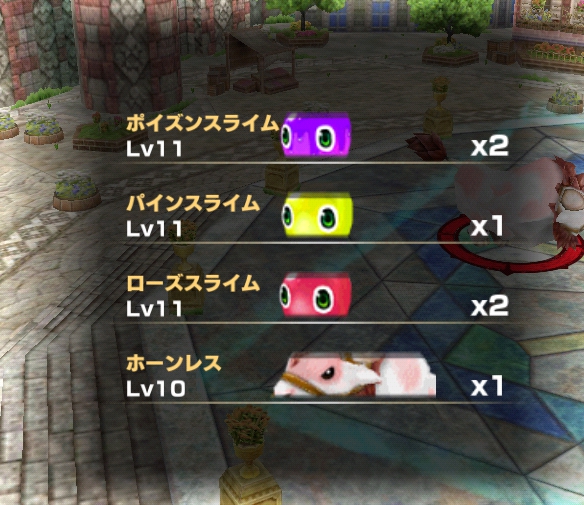 ステージ3では、ポイズンスライム2体、パインスライム1体、ローズスライム2体、ホーンレス1体が登場します。