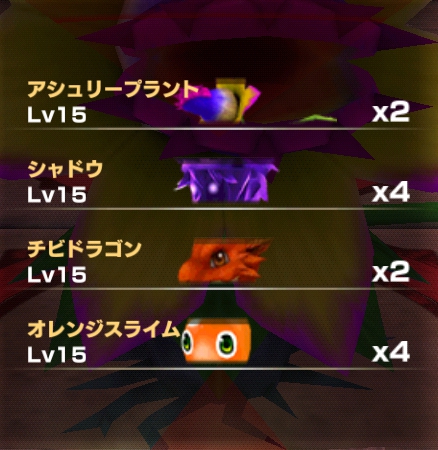最初のステージでは、アシュリープラント2体、シャドウ4体、チビドラゴン2体、オレンジスライム4体が登場します。