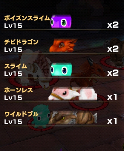 ステージ2では、ポイズンスライム2体、チビドラゴン2体、スライム2体、ホーンレス1体、ワイルドブル1体が登場します。