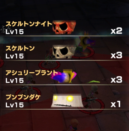 ステージ3では、スケルトンナイト2体、スケルトン3体、アシュリープラント3体、プンプンダケ1体が登場します。