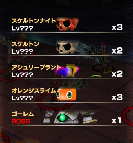最終ステージでは、スケルトンナイト3体、スケルトン2体、アシュリープラント2体、オレンジスライム3体、ゴーレム1体が登場します。