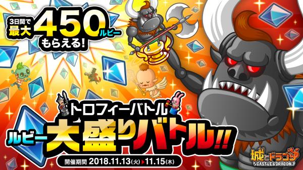 株式会社アソビズム(本社:東京都千代田区、代表取締役:大手智之)は、App Store・Google Playにて好評配信中の『城とドラゴン』で、「トロフィーバトル」および「ルビー大盛りバトル」を2018年11月13日(火)より開催いたします。