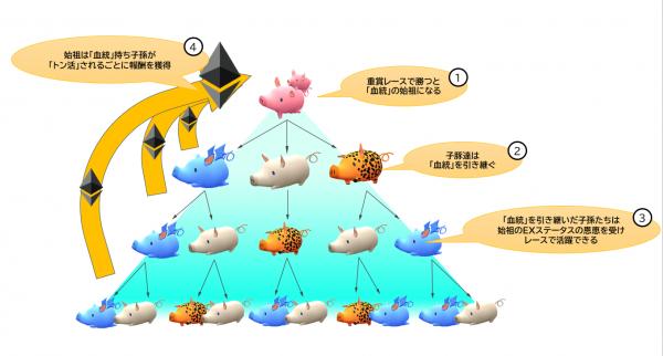 血統を持つくりぷトンは、レースで能力値が加算されるなどのメリットがあり、血統の始祖となるくりぷトンを持つオーナーは、子孫がトン活(プレイヤー間のくりぷトンの交配)をする毎に、ボーナス(報酬)を得ることができるシステムとなっております。