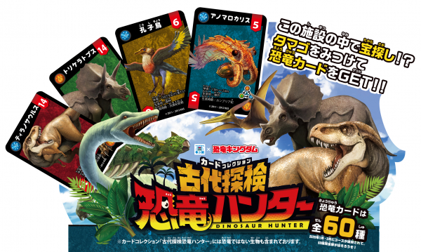 参加者は「恐竜図鑑」に描かれた暗号を解読し、宝の地図を活用すると、施設内に隠されたタマゴを発見することができます。見事、タマゴを発見した方には、恐竜カードをプレゼント。恐竜カードは全60種。レアカードも存在し、カードコレクションを楽しむことができます。また、自宅では恐竜カードでデッキを組んでオリジナルの恐竜カードバトルもプレイ可能。兄弟やお友だちと熱い恐竜カードバトルを繰り広げましょう!