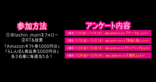 11月8日(金)より4週連続のBLアンケートをらしんばん公式Twitterにて開催いたします。