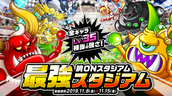 11月8日(金)から11月15日(金)まで、腕ONスタジアムにて新イベント「最強スタジアム」が開催されます。本イベントは、選出キャラのすべてが“キャラLv35相当の強化状態”で戦うバトルイベントで、通常以上に迫力のある攻防が楽しめます。また、11月9日(土)より3日間は、「トロフィーでメダル争奪バトル」や「フリー対戦友トレ争奪バトル」も開催されます。