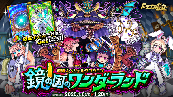 株式会社アソビズム(本社:東京都千代田区、代表取締役:大手智之)は、App Store・Google Playにて好評配信中のリアルタイム合体カードバトル『ドラゴンポーカー』で、2020年1月6日(月)より復刻スペシャルダンジョン「鏡の国のワンダーランド」を開催いたします。