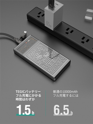 「TEGICモバイルバッテリー」には高密度リチウムポリマーチップが内蔵されており、効率的かつ安全な充電を行うことができます。容量は10,000mAhと大容量で、あなたのスマホやゲーム機など様々なデバイスを充電できます。