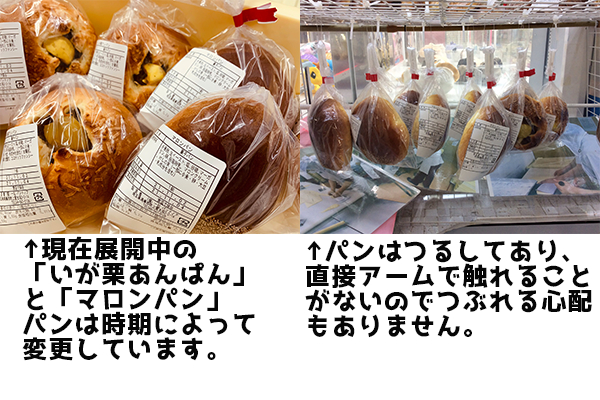 4月1日から始まったパンキャッチャーは、沢山のお客様に楽しんでいただけており、早い時では開店から2時間ほどで完売してしまうほどの人気となっています。さらに、いつ来ても楽しめるように時期によってパンを変えています。現在は秋ということで「いが栗アンパン」をメインに日替わりで「マロンパン」「カレーパン」を展開中です。