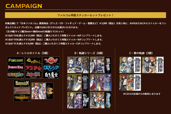 立川会場:コトブキヤ立川本店では、ファルコム特製ステッカーセットプレゼントキャンペーンの特典に軌跡シリーズ新作『英雄伝説 黎の軌跡 (クロノキセキ)』のステッカー(3種)が追加となります。