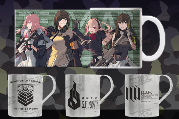 ミリタリー風にデザインされたAR小隊のメンバーのイラストが映えるフルカラーマグ