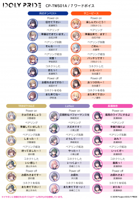 本コラボレーションモデルは、「月のテンペスト」「サニーピース」「TRINITYAiLE」「LizNoir」「長瀬麻奈」の全5種類展開となっており、イヤホン本体にそれぞれを象徴するマークやデザインを印刷加工をしております。また特筆すべきは各イヤホン本体にゲームボイスを使用した7ワードのボイスガイダンスを搭載し限定感を演出しております。