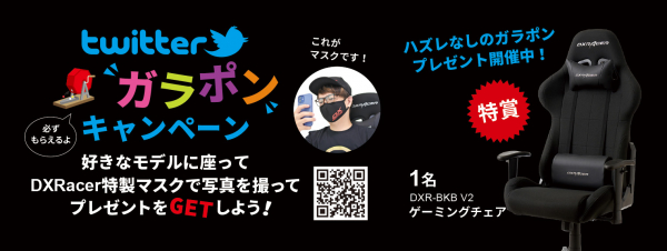 ブース内では、ゲームショウ会期期間中を通してゲーミングチェアやDXRacerオリジナルノベルティなど豪華賞品が当たるツイッターガラポンキャンペーンを開催。”ブース内の好きなモデルに座り、DXRacer特製オリジナルマスクをつけて写真を撮って豪華プレゼントをGETしよう!”