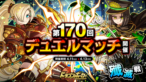 株式会社アソビズム(本社:東京都千代田区、代表取締役:大手智之)は、App Store・Google Playにて好評配信中のリアルタイム合体カードバトル『ドラゴンポーカー』で、2023年4月11日(火)より「第170回デュエルマッチ本戦」を開催いたします。