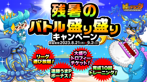 株式会社アソビズム(本社:東京都千代田区、代表取締役:大手智之)は、App Store・Google Playにて好評配信中の『城とドラゴン』で、2023年8月21日(月)より「残暑のバトル盛り盛りキャンペーン」を開催いたします。