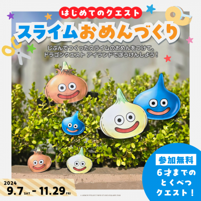 自分だけのスライムおめんをつくって冒険へ出かけよう! はじめてのクエスト「スライムおめんづくり」開催 ~「ドラゴンクエスト アイランド」秋のキッズイベントが9月7日(土)より開催~