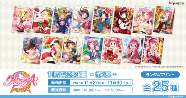 株式会社インクルーズ(東京都渋谷区、代表取締役社長 山﨑 健司)は、11月2日(日)より、日本全国のコンビニエンスストア店内のマルチコピー機を中心に、気軽にプリントできる「インクルーズプリント by eプリントサービス」にて「グリモアA ~私立グリモワール魔法学園~」11周年を記念したコンテンツプリントの第4弾がランダム式で販売開始したことをご報告させていただきます。
