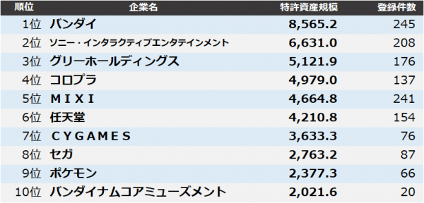 【ゲーム・エンターテインメント】特許資産規模ランキング2025 トップ3はバンダイ、SIE、グリー