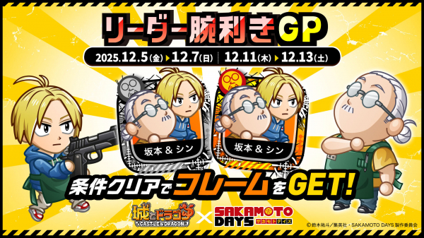 12月11日(木)6:00より、TVアニメ『SAKAMOTO DAYS』コラボ限定キャラ「坂本&シン」の「キャラフレP」を競う、「リーダー腕利きGP」の2回目が開催!ランキング上位者や条件を達成した方には、コラボ限定「キャラフレーム」が贈られます。コラボ限定キャラをリーダーにして期間中のリーグに挑みましょう!