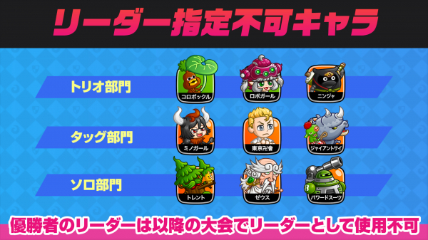 予選大会の優勝者が設定したリーダーキャラは、以降の大会において「リーダー確定枠」に設定できません(ただし、ランダムデッキで選出された場合や、サブリーダーとしての使用には制限はありません)。