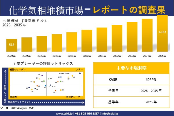 SDKI Analytics(本社:東京都渋谷区)は、このたび、2025年12月04に「化学気相堆積市場調査レポート:2026-2035年の市場規模、シェア、傾向の予測」を発表しました。化学気相堆積に関する市場調査レポートには、統計的および分析的アプローチを使用した予測評価が含まれています。この調査レポートでは、一次および二次調査方法を使用して分析された主要な業界洞察を通じて将来の傾向を理解できるようにすることで、主要な市場動向を読者に説明しています。