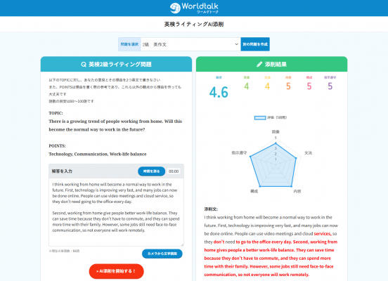 株式会社ライトアップ(本社:東京都渋谷区、代表取締役社長:白石崇)が運営する、日本人講師メインのオンライン英会話スクール「ワールドトーク」(https://www.worldtalk.jp/)は、英検(R)スピーキングおよびライティング対策に特化した「AI添削ツール」を、2025年12月17日(水)より一般公開いたしました。会員登録後に無料でご利用いただける本ツールでは、従来のオンライン対面学習を補完し、自宅や通学・通勤中にも本番形式の英検(R)対策が可能になります。(※音読ツールの利用には体験レッスンの予約が必要です)