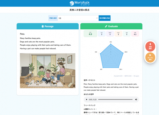 英検(R)対策を“AI”で強化!音読・ライティングを即スコア化 オンライン英会話「ワールドトーク」が、無料で使える英検(R)専用AI添削ツールを公開 【ドリームニュース】