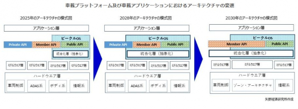 2025年のアーキテクチャの模式図のように、車載プラットフォームは情報系やボディ系の一部をカバーしたものとなっており、未成熟ではあるものの、OEM(自動車メーカー)各社は完成形に向けて開発を進めている。OEM各社は併せて、Member API(Application Programming Interface)やPublic API※を活用した車載アプリケーションを中心に複数のアプリケーションの開発を進めており、ラインアップを増やすべく取り組んでいる状況にある。