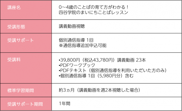 こうした背景を踏まえ、四谷学院通信講座では言語聴覚士の編集協力のもと、保護者が日常生活の中で無理なく実践できる「ことばの育て方」を体系的に学べる講座を開講する運びとなりました。