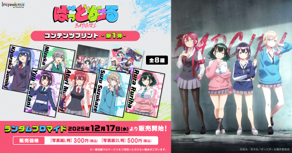 株式会社インクルーズ(東京都渋谷区、代表取締役社長 山﨑 健司)は、12月17日(水)より、日本全国のコンビニエンスストア店内のマルチコピー機を中心に、気軽にプリントできる「インクルーズプリント by eプリントサービス」にて、TVアニメ『ばっどがーる』のコンテンツプリント第1弾がランダム式で販売開始したことをご報告させていただきます。