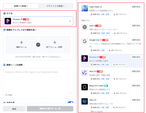 用途や表現テーマに合わせて、最新の動画生成モデルを選択します。複数モデルを試しながら最適な表現を追求できます。